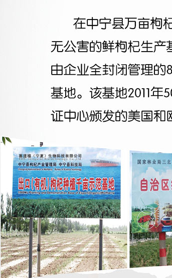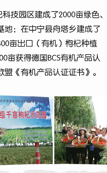 我公司得益于銀川市金鳳區政府各部門領導的關愛與扶持,逐漸成長為國內枸杞行業集種植、加工、銷售于一體的較大規模的民營企業之一,我們努力爭創農業產業化國家重點龍頭企業、寧夏回族自治區農業產業化優秀龍頭企業、寧夏枸杞知名品牌企業,農產品流通骨干企業。