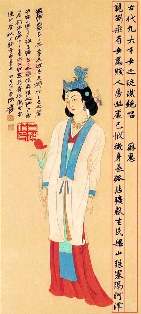 蘇惠,字若蘭,十六國時(shí)期東扶風(fēng)人(現(xiàn)今陜西咸陽武功人),生于公元357年。若蘭容貌秀麗,舉止嫻雅。其夫竇滔因厭戰(zhàn)違軍令,被貶配流沙,邂逅歌妓趙陽臺,納為偏房。后竇滔奉旨鎮(zhèn)襄陽,本欲攜妻妾同往,可蘇蕙為納妾之事情閾憤拒,竇惟攜妾赴任。蘇蕙孤守空閨,日久,甚感寂空難耐。其便吟詩作文以遣孤寂時(shí)光。