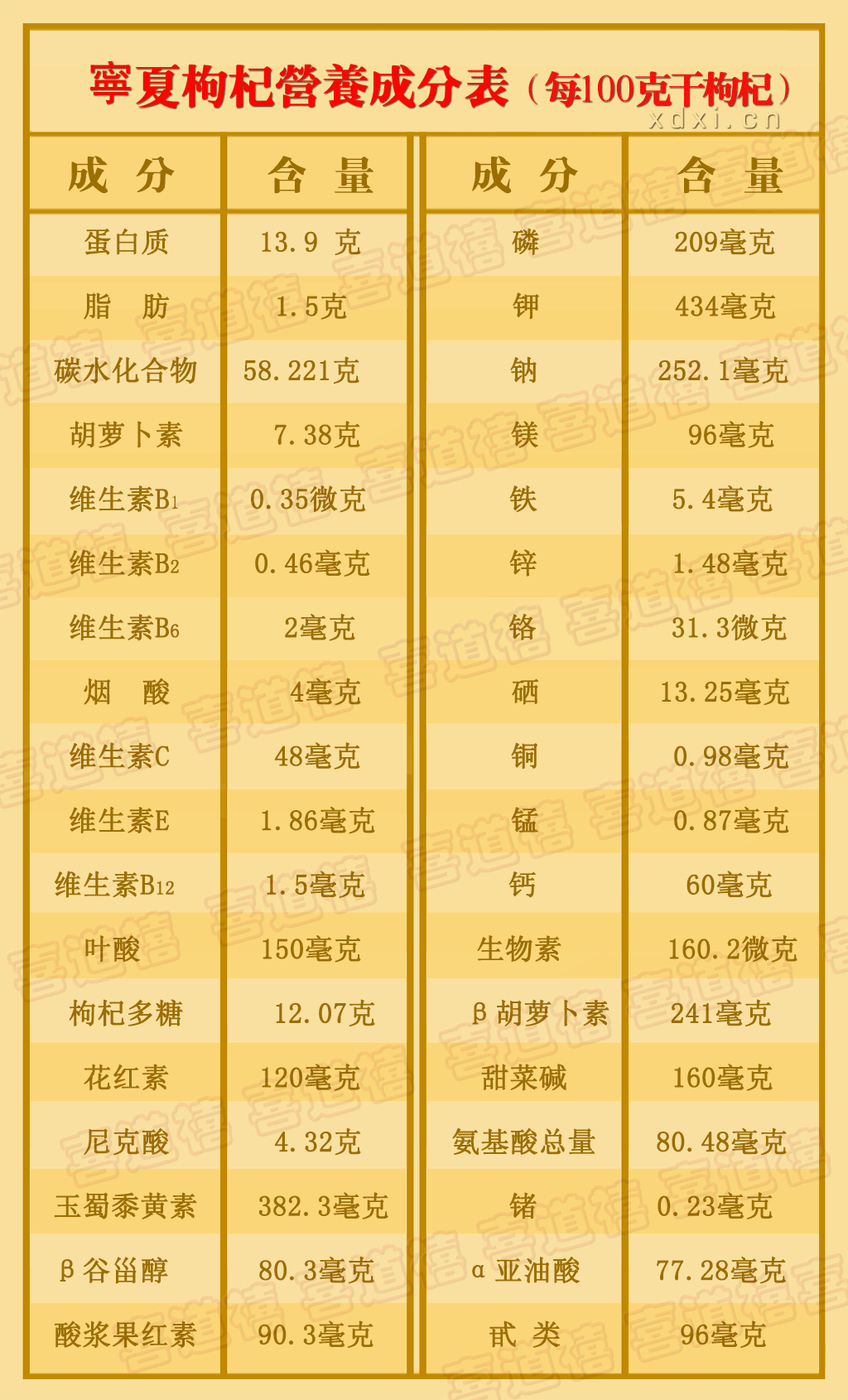 同時,又因為生產工藝的不同,如普通日照晾曬工藝、室內高溫風干工藝、室內常溫風干工藝、密閉低溫風干工藝、密閉低溫凍干加風干工藝等的不同,導致枸杞干制品的營養成分又有很大的不同和變化,加上各個階段的鮮枸杞的干制品的內容物及所含營養成份更有很大變化,現將夏季每100克喜道禧枸杞干果中所含的營養成分公布如下表,這只是若干化驗中的某一次化驗結果。